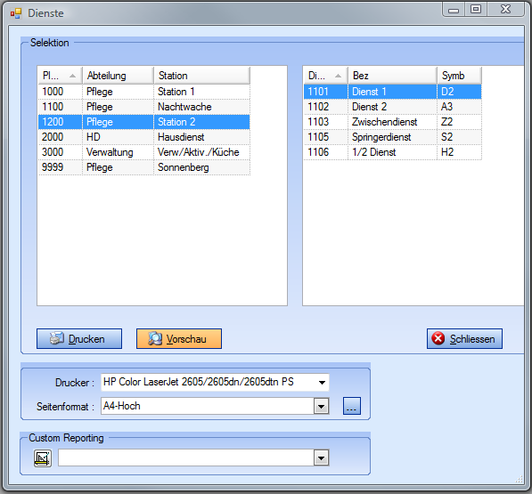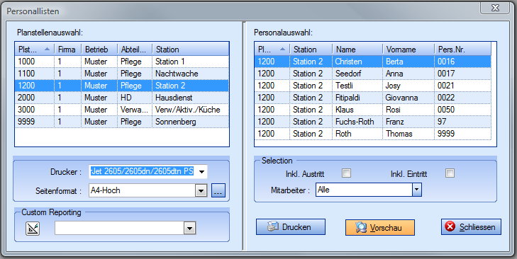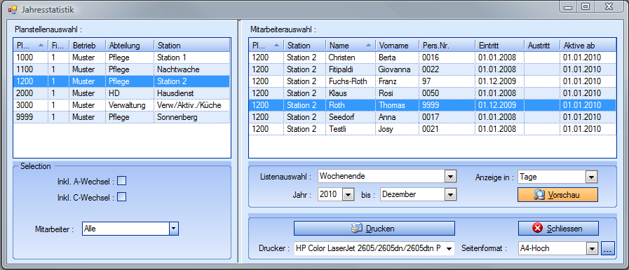 Nun müssen Sie nur noch das Jahr, den Monat und das Format festlegen und mit Vorschau die Liste erstellen.Auf der linken Seite haben Sie wieder die Planstellenauswahl.