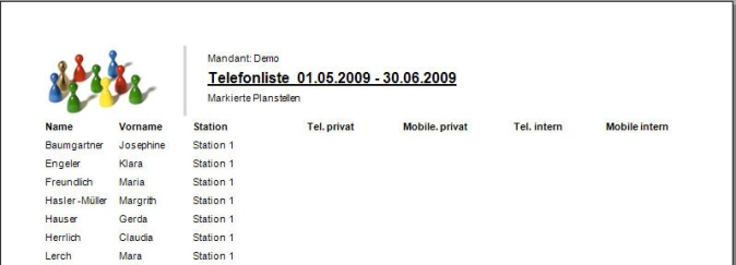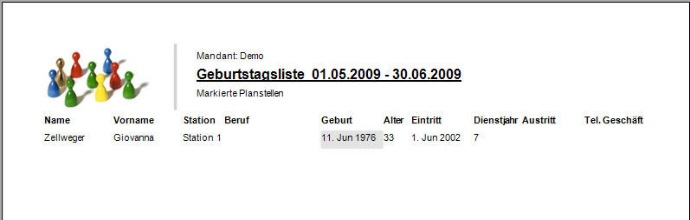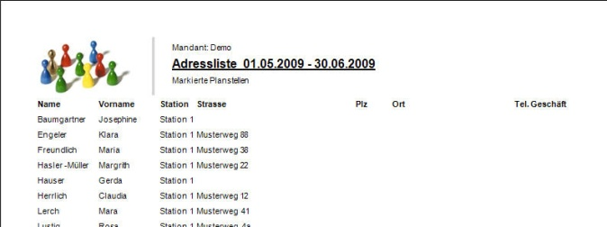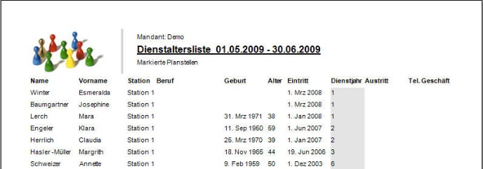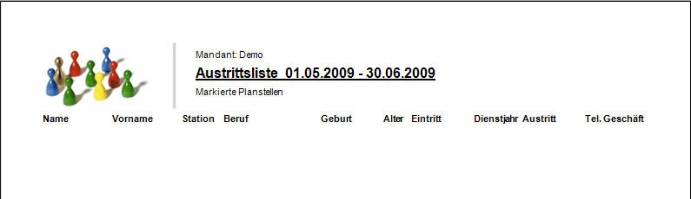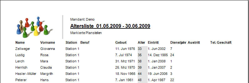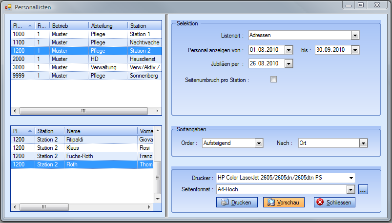 Auf der rechten Seite oben in der Auswahlbox „Listenart" können Sie zwischen den Listen Adressen, Geburtstag, Dienstalter, Alter, Telefonliste, Eintritt und Austritte wählen. Auf der linken Seite oben sehen Sie die Liste der Planstellen.