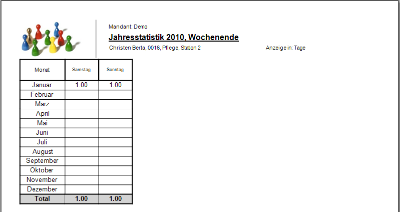 Mit dem Tool „Jahresstatistik" haben Sie die Möglichkeit verschiedene Statistiken pro Mitarbeiter zu erstellen. Die Auswahl der Listen ist abhängig von den zuvor erstellten Listen. Siehe Kapitel „Statistiklisten erstellen".