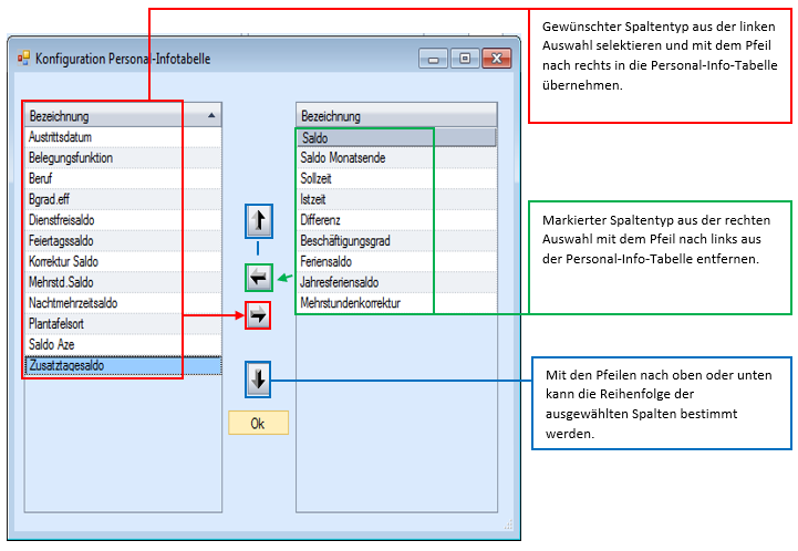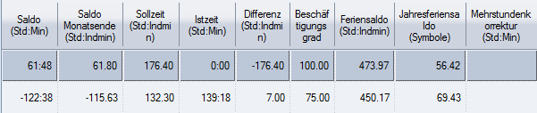In der Pers-Info Tabelle können Sie verschiedenste Angaben zur Person eines bestimmten Tages bzw. Monats anzeigen lassen. Welche der vielen möglichen Werte Sie angezeigt haben möchten, bestimmen Sie selber. In der folgenden Abbildung sehen Sie eine Auswahl davon.
