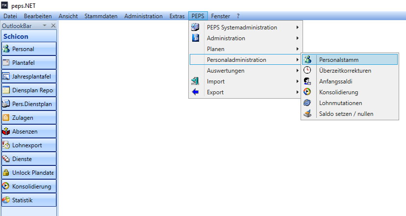 NEXUS / PEPS NEXUS / PEPS - Handbücher Handbuch Personaladministration Current: Personaladministration Personaladministration In der Menüleiste unter «PEPS»_ «Personaladministration»_ «Personalstamm» gelangen Sie zum Personalstammblatt. Das Personalstammblatt können Sie auch öffnen, wenn Sie direkt in der Plantafel auf den Namen doppelklicken. ×