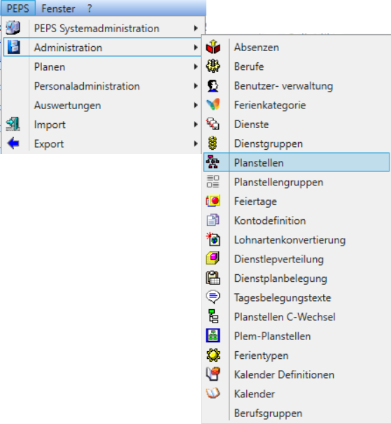 In der Menüleiste unter PEPS / Administration / Planstellen gelangen Sie zu der Planstellen- Verwaltung.