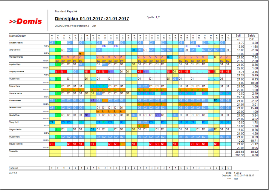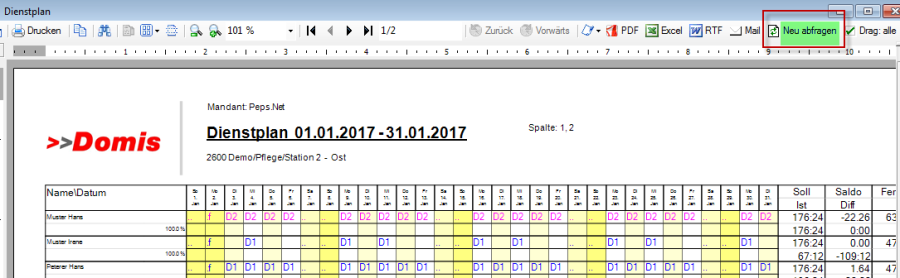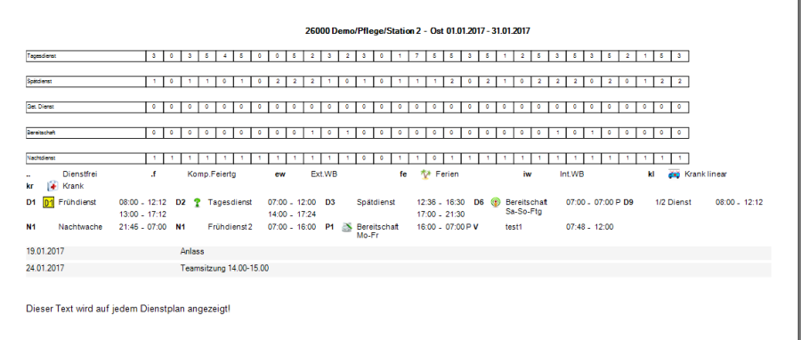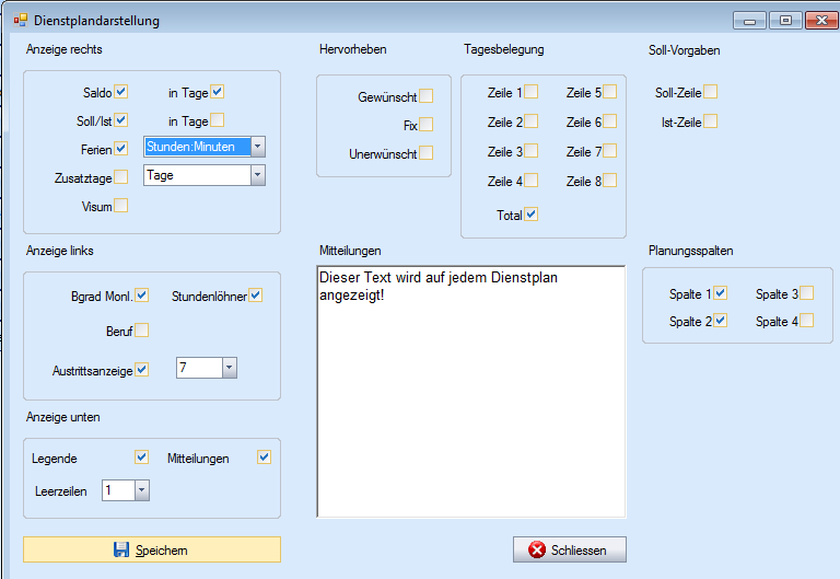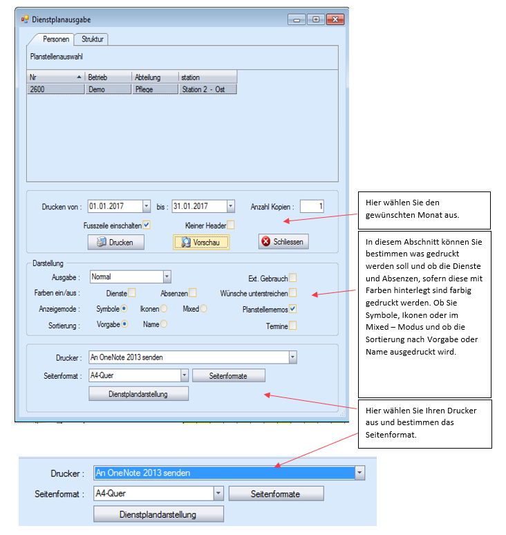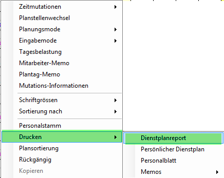 NEXUS / PEPS NEXUS / PEPS - Handbücher Handbuch Memos Current: Plantafel ausdrucken Plantafel ausdrucken Mit einem Klick mit der rechten Maustaste in der Plantafel öffnet sich Ihnen folgendes Dialogfeld: Es öffnet sich die Vorschau des Dienstplans der aktuellen Planstelle und des aktuellen Monats. Mit der Schaltfläche „Neu abfragen" öffnen Sie das Druckdialogfeld. Unter der Dienstplandarstellung können Sie bestimmen was alles gedruckt werden soll. Hier legen Sie fest welche Spalten auf der rechten Seite angezeigt werden sollen. Sie können bestimmen wie die Spalten angezeigt werden sollen. In diesem Feld können Sie bestimmen ob die gewünschten, fixen und unerwünschten Dienste hervorgehoben werden sollen. (Agenda) Durch Haken setzen in den Kästchen können Sie auswählen welche Zeile vom Tagesbelegungstext gedruckt werden soll. In diesem Feld können Sie bestimmen ob die Soll – Vorgaben anstelle der Tagesbelegungstexte angezeigt werden In diesem Feld bestimmen Sie welche Informationen auf der linken Seite unter dem Namen angezeigt werden. Hier bestimmen Sie ob die Dienst-, Abwesenheiten-Legende und die Mitteilungen gedruckt werden. Hier bestimmen Sie welche Tagesspalten gedruckt werden sollen. Mit dieser Schaltfläche speichern Sie Ihre Einstellungen. ×