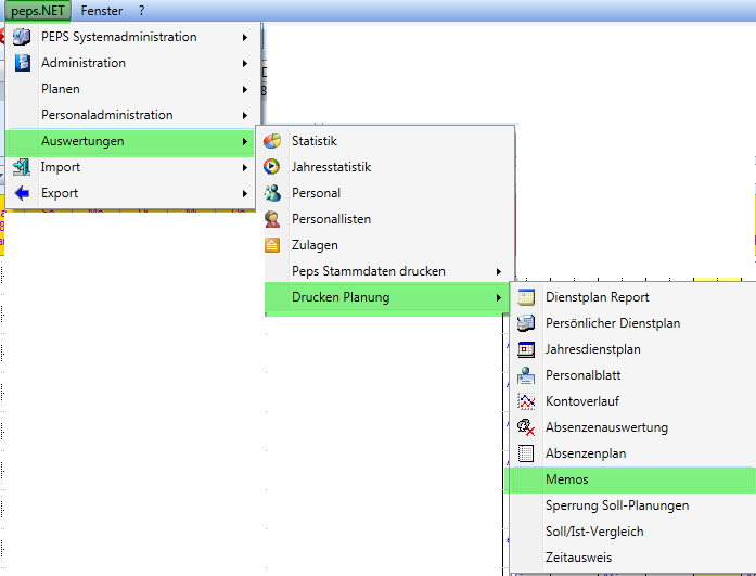 Unter PEPS / Auswertung / Drucken Planung / Memo können die Memo's ausgedruckt werden.