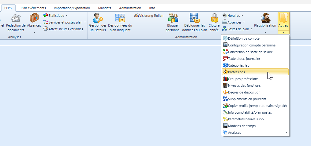 Sous PEPS – Administration – Autres - Professions, vous pouvez saisir les professions de vos collaborateurs.