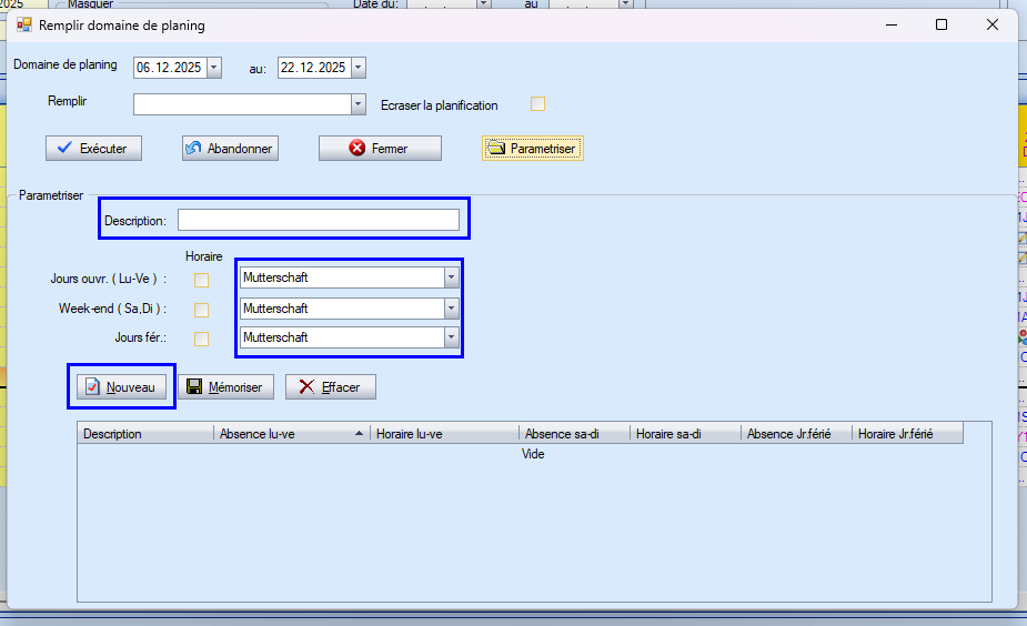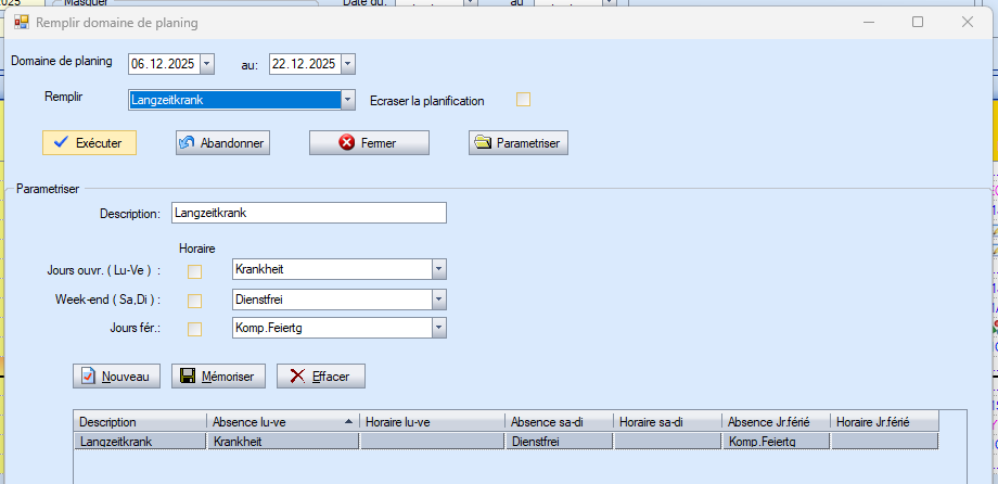 Procédez de la même manière dans les deux lignes suivantes « Week-end » et « Jours fériés ». Seulement ici, les absences sont bien sûr « Congé » et « Compensation jour férié ». Cliquez sur « Nouveau » pour ajouter la règle à la liste ci-dessous.