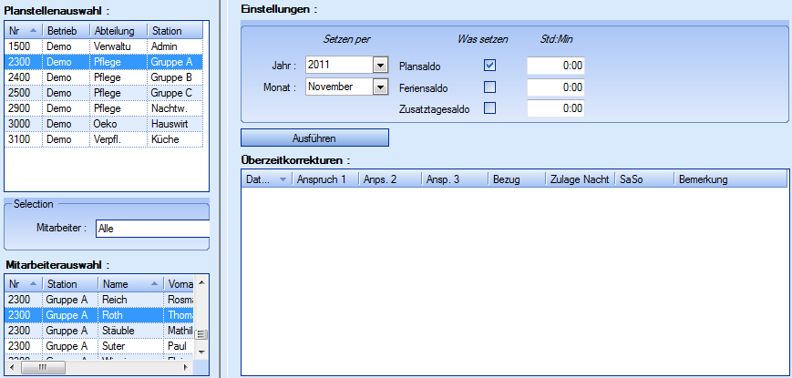 Im oberen Teil sehen Sie die Planstellenauswahl. Hier wählen Sie die Planstelle aus in der sich der Mitarbeiter befindet.