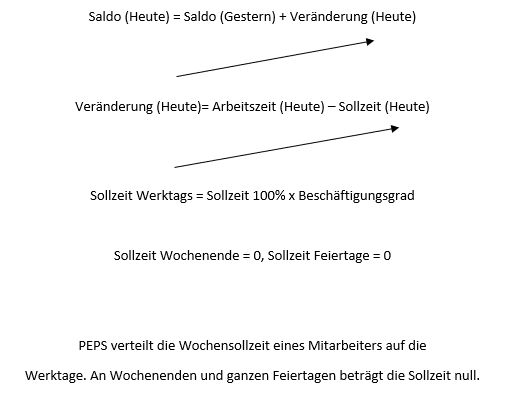 Die Saldoberechnung basiert auf die beiden Fragen, wie viel muss ein Mitarbeiter aufgrund seiner Anstellung arbeiten (Sollzeit), und wie viel hat ein Mitarbeiter gearbeitet (Ist Zeit). Wenn diese beiden Fragen beantwortet sind, kann ein Saldo ermittelt werden. Wobei ein positiver Saldo bedeutet, dass der Mitarbeiter zu viel gearbeitet hat.