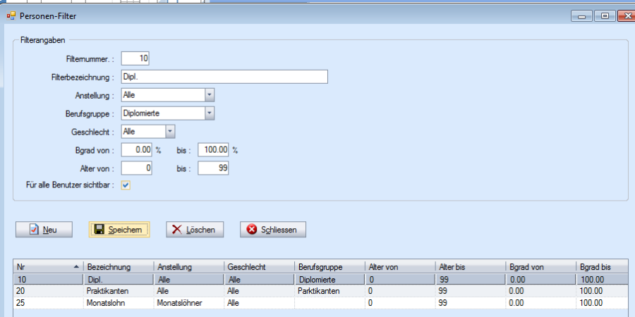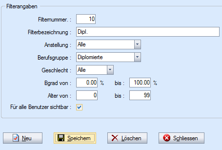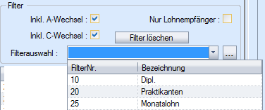Die Angaben für Filter bestehen aus einer Nummer, die Anstellung ob alle Mitarbeiter oder nur jene im Monatslohn, nach Berufsgruppe, Geschlecht, Beschäftigungsgrad und Alter selektiert werden sollen.