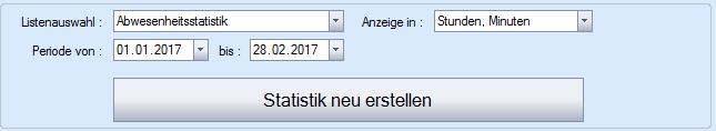 In der Listenauswahl können Sie aus den Ihnen zur Verfügung stehenden Listen wählen. Danach geben Sie das Datum von – bis ein. Sie wählen aus ob die Anzeige in Stunden, Minuten – Stunden, Industrieminuten oder Tagen sein soll. Klicken Sie auf die Schaltfläche „Statistik neue erstellen" um die Statistik zu erstellen