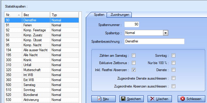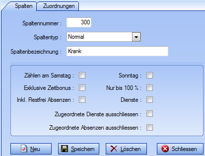 Im Feld „Spaltenbezeichnung" können Sie eine Bezeichnung nach Ihrer Wahl eingeben, im Beispiel „Krank". Im unteren Teil darf kein Hacken gesetzt sein. Mit „Neu" übernehmen Sie die Spalte in die Liste „Statistikspalten". Wenn Sie Ihre Spalteneinstellung gemacht haben wechseln Sie bitte ins Register „Zuordnung".