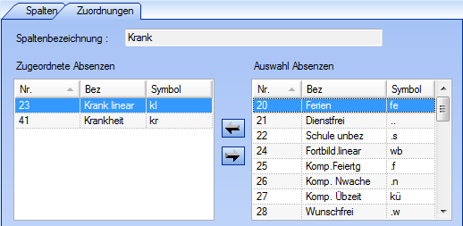 In der Spaltenbezeichnung sehen Sie den von Ihnen, im Register „Spalten" gemachten Eintrag. Unter „Auswahl Absenzen" sehen Sie die Liste aller in Ihrem Haus gültigen Absenzen. Hier können Sie die Absenz auswählen die Sie auswerten wollen. Mit dem Pfeil nach rechts übernehmen Sie die Absenz in die Liste „Zugeordnete Absenzen." Sie können nun das Fenster schliessen.