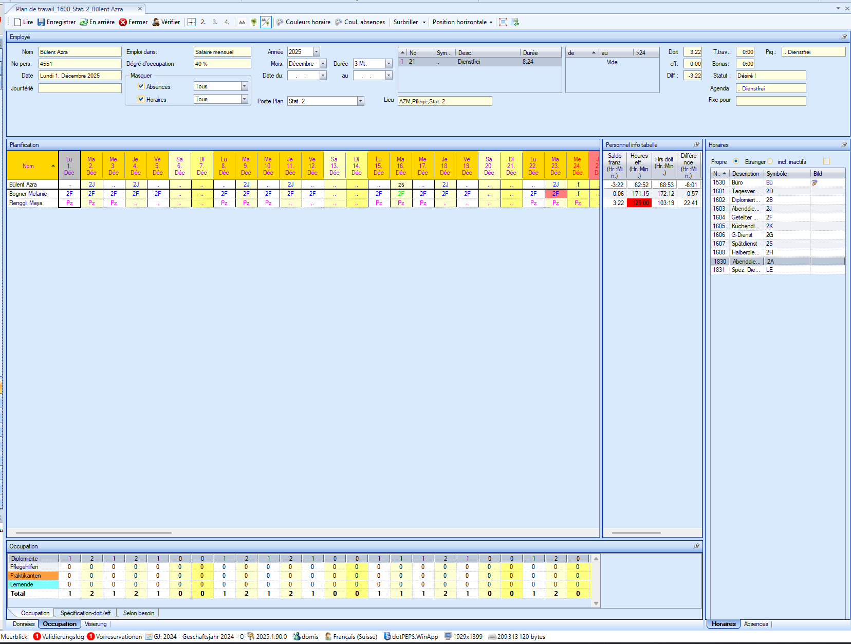 À droite se trouve le tableau des informations sur le personnel avec les informations sur les employés et, juste à côté, la sélection des services et des absences.