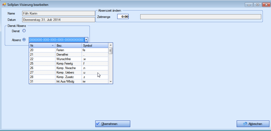 Info für „Visierung bearbeiten" bei Diensten und Absenzen:> liegt das Datum in der Zukunft werden die visierten Soll-Daten wie auch die normalen Plandaten mutiert> liegt das Datum in der Vergangenheit oder ist es der heutige Tag, dann wird nur der visierte Soll-Eintrag mutiert, aber nicht der Plantafel-Eintrag