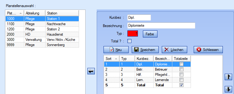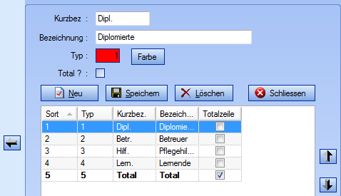 Den Typ als Ziffer (Reihenfolge der Zeile). Zudem können Sie hier für jeden Typ eine Farbe erfassen. Dies erleichtert Ihnen die Suche auf dem Dienstplan