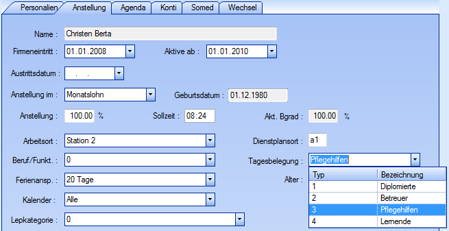 Damit die Mitarbeiter in der Tagesbelegungszeile gezählt werden, müssen Sie nun, im Personalstammblatt unter „Anstellung", im Textfeld „Tagesbelegung", die erforderliche Bezeichnung auswählen.