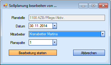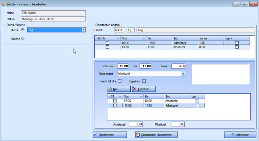 Die Sollplanung des Tages und Dienstes welches mutiert werden soll wird auf der Maske angezeigt. Dieser kann nun ausgetauscht und/oder die Zeiten bearbeitet werden. Mit Dienstzeiten übernehmen werden die Dienstzeiten in die Sollzeit dieses Tages übernommen und gespeichert. Mittels des Buttons [Übernehmen] werden die mutierten Zeiten in die Sollzeit des Tages geschrieben.