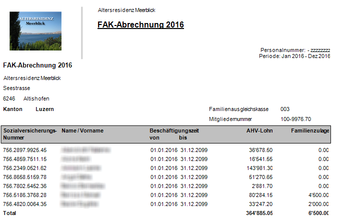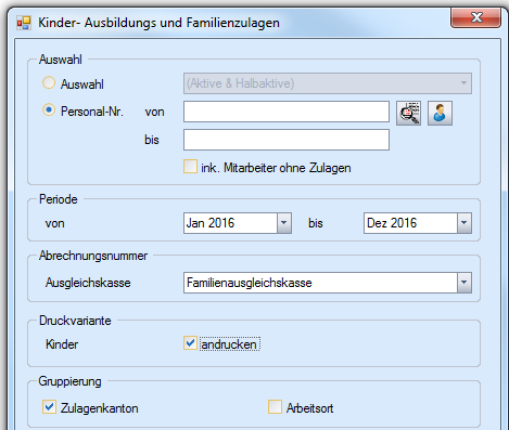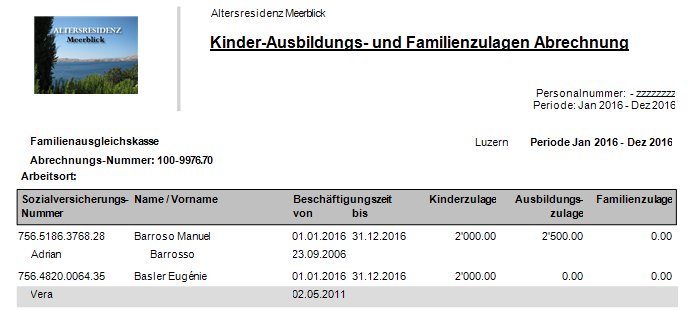 Die Kinderzulagenabrechnung erfolgt mittels der Liste „Kinder-, Ausbildungs- und Familienzulagenabrechnung". Dies ist eine Auflistung aller ausbezahlten Familienzulagen (Kinder- und Ausbildungszulagen).