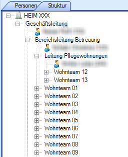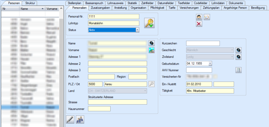 Im linken Teil der Maske werden die Personen aufgelistet, entweder als Tabelle oder als Strukturbaum (Voraussetzung: eingerichtete Firmenorganisationsstruktur). Im rechten Teil der Maske werden die diversen Mitarbeiterinformationen in einzelnen Registern gepflegt.