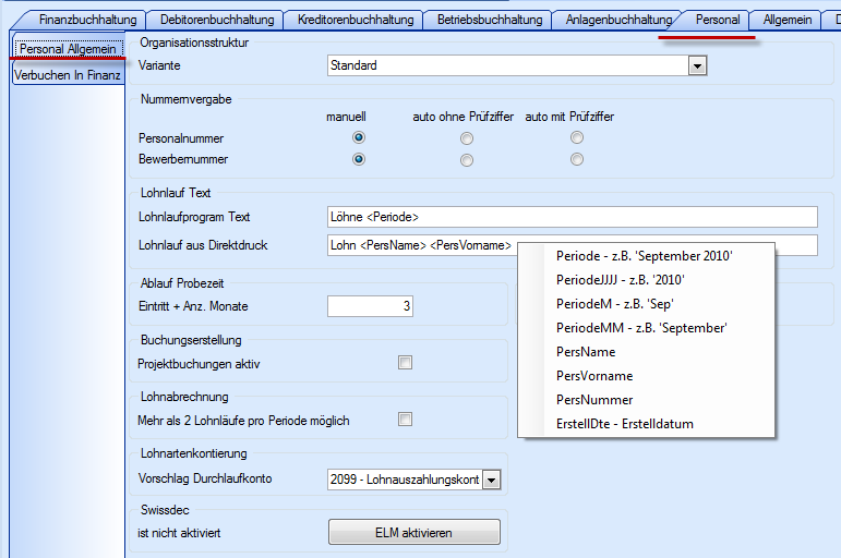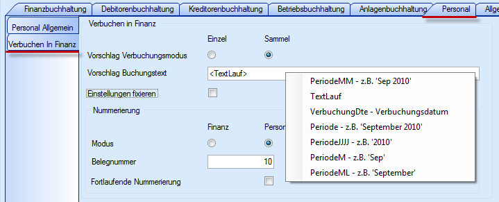 Für die Verbuchung der Lohnbuchungen in die FIBU können unter dem Bereich ‚Verbuchen in Finanz' gewisse Einstellungen hinterlegt werden.