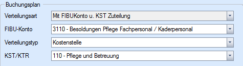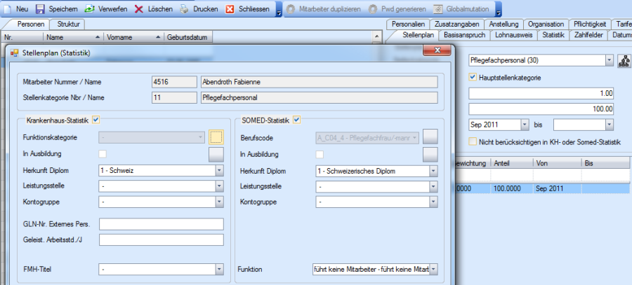 Im Feld Kontogruppe im Personalstamm unter Stellenplan/Statistik, ist der Wert Konto 31 (Pflegepersonal) ist nicht mehr erlaubt. SOMED verlangt die Aufteilung wie folgt: