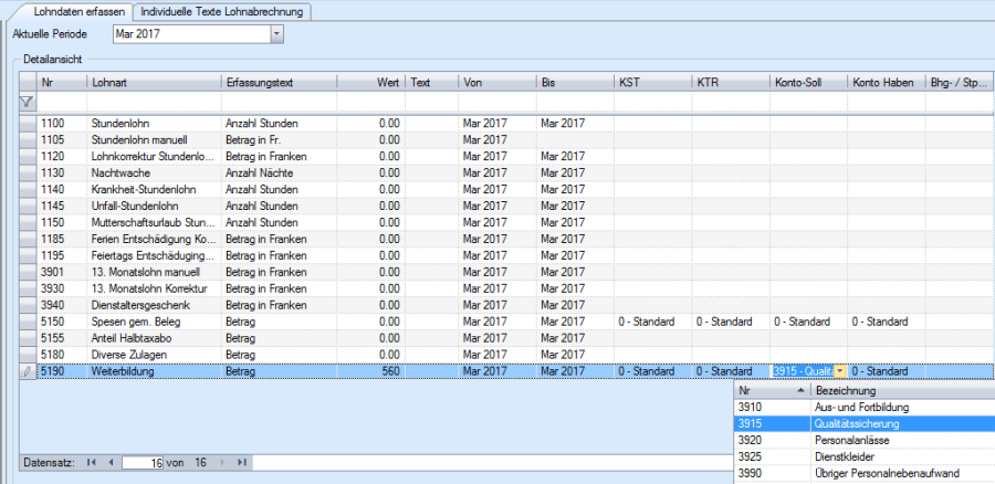 Lohnarten bei denen die Option ‚buchungswirksam' aktiviert ist, erkennen Sie daran dass bei der Lohndatenerfassung in den Spalten KST / KTR / Konto-Soll / Konto-Haben der Wert 0-Standard steht.