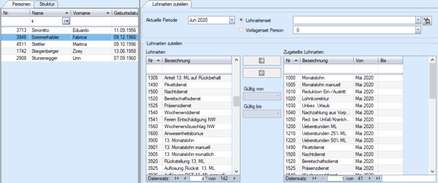 Im linken Fensterbereich sehen Sie die Lohnarten die für die Zuweisung bereitsehen. Im rechten Fensterbereich sehen Sie die zugewiesenen Lohnarten der selektierten Person.