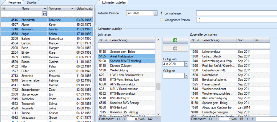 Jeder Person die nötigen Lohnarten zuteilen. Nur für die zugeteilten Lohnarten können Lohndaten erfasst werden. Weitere, neu erstellte Lohnarten lassen sich jederzeit individuell oder global zuteilen.