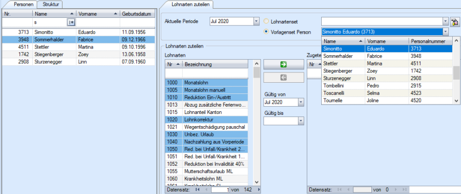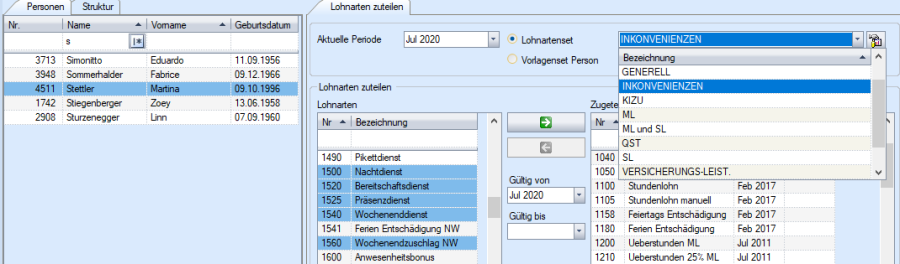 Die Zuteilung kann auf verschiedene Arten vorgenommen werden. Achten Sie vor der Zuteilung auf jeden Fall auf ‚Gültig von…' damit Sie die Lohnarten in derjenigen Lohnperiode zugewiesen haben, in der Sie sie brauchen.