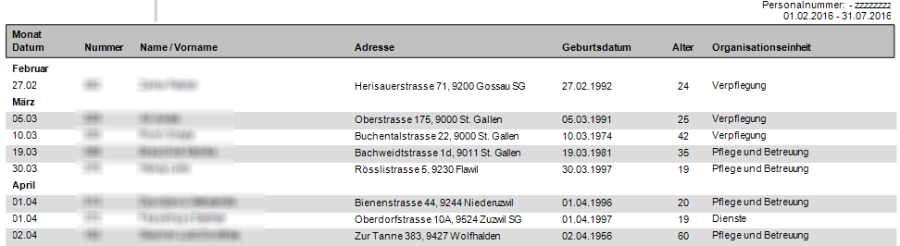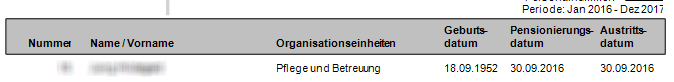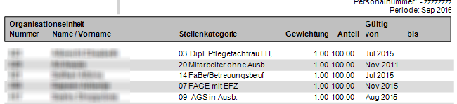 Eine Zeile pro Person mit diesen Informationen. Gruppierung nach Kostenstelle, nach Organisation, nach Stellenkategorie möglich.