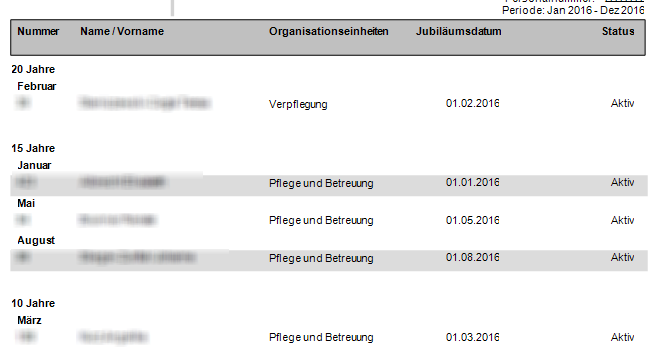 Erstellt eine Liste mit den Jubiläen oder Dienstalter der Mitarbeiter in einem festgelegten Zeitraum.