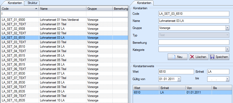 Beispiel der Konstanten, mit denen gesteuert wird welche Lohnarten auf der Liste angezeigt werden.