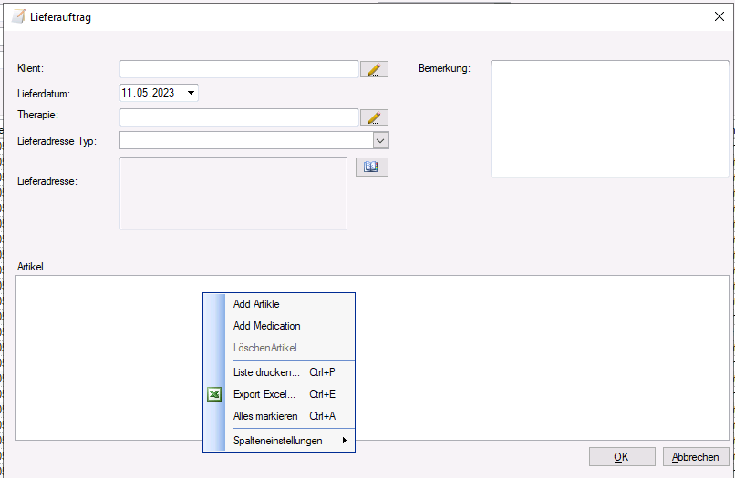 • Artikel: Im Fenster Artikel können dem Lieferauftrag sowohl Artikel als auch Medimente hinzugefügt werden.