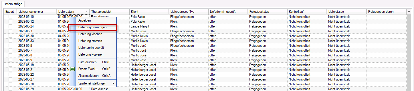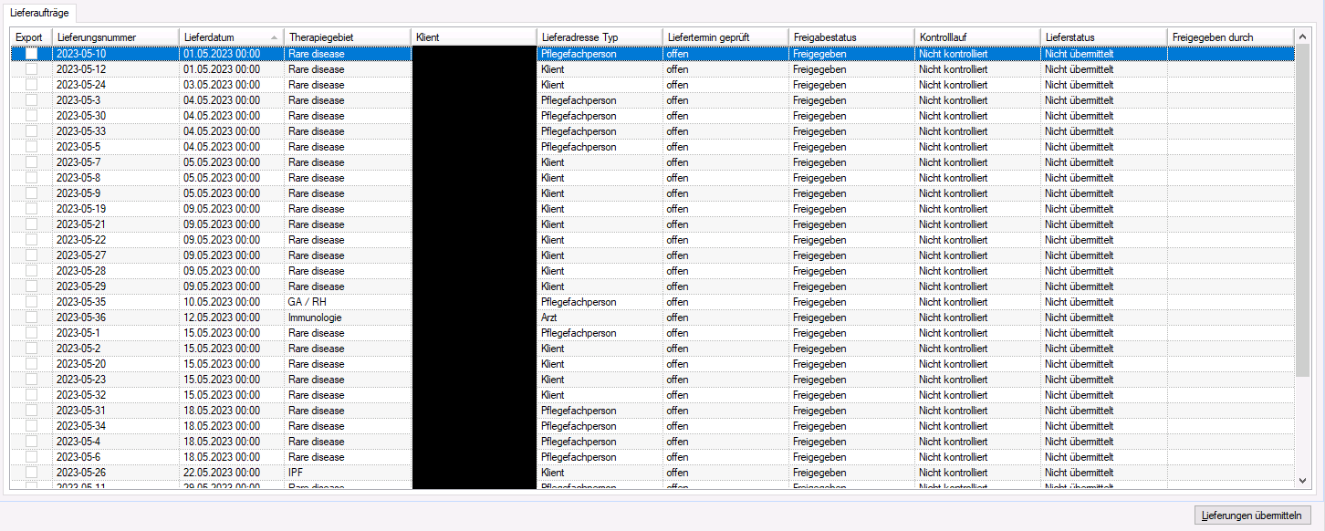 KlientHier wird der Name des Klienten angezeigt, zu dessen Therapie der jeweilige Lieferauftrag gehört. Jeder Lieferauftrag kann einer klientenspezifischen Therapie zugeordnet werden.