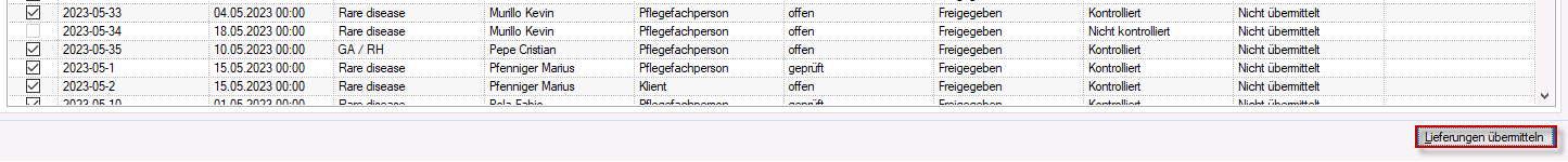 FreigabestatusNur Lieferaufträge von freigegebenen Therapien können exportiert werden. Bei Änderungen laufender Therapien kann der Freigabestatus auf Lieferaufträge temporär entzogen werden bzw. auf "verändert" wechseln. Mit diesem Filter können verschiedene Lieferstati gesucht bzw. ausgeschlossen werden.