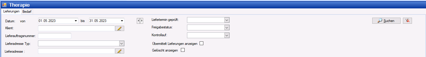 Im Reiter Lieferungen des Moduls Therapie stehen die nachfolgenden Filteroptionen zur Verfügung, um die Lieferaufträge zu filtern:
