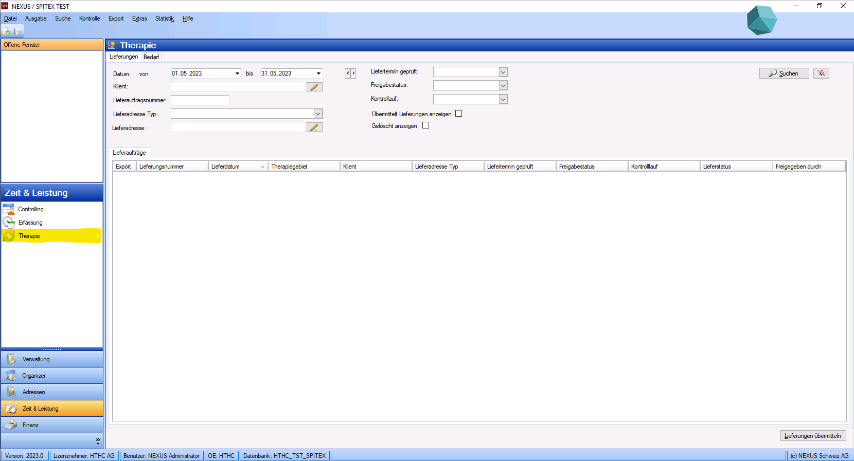 Im Modul "Therapie" unter dem Pfad Zeit & Leistung > Therapie werden die Lieferaufträge sowie der Bedarf für anstehende Lieferungen an MAWI übermittelt.