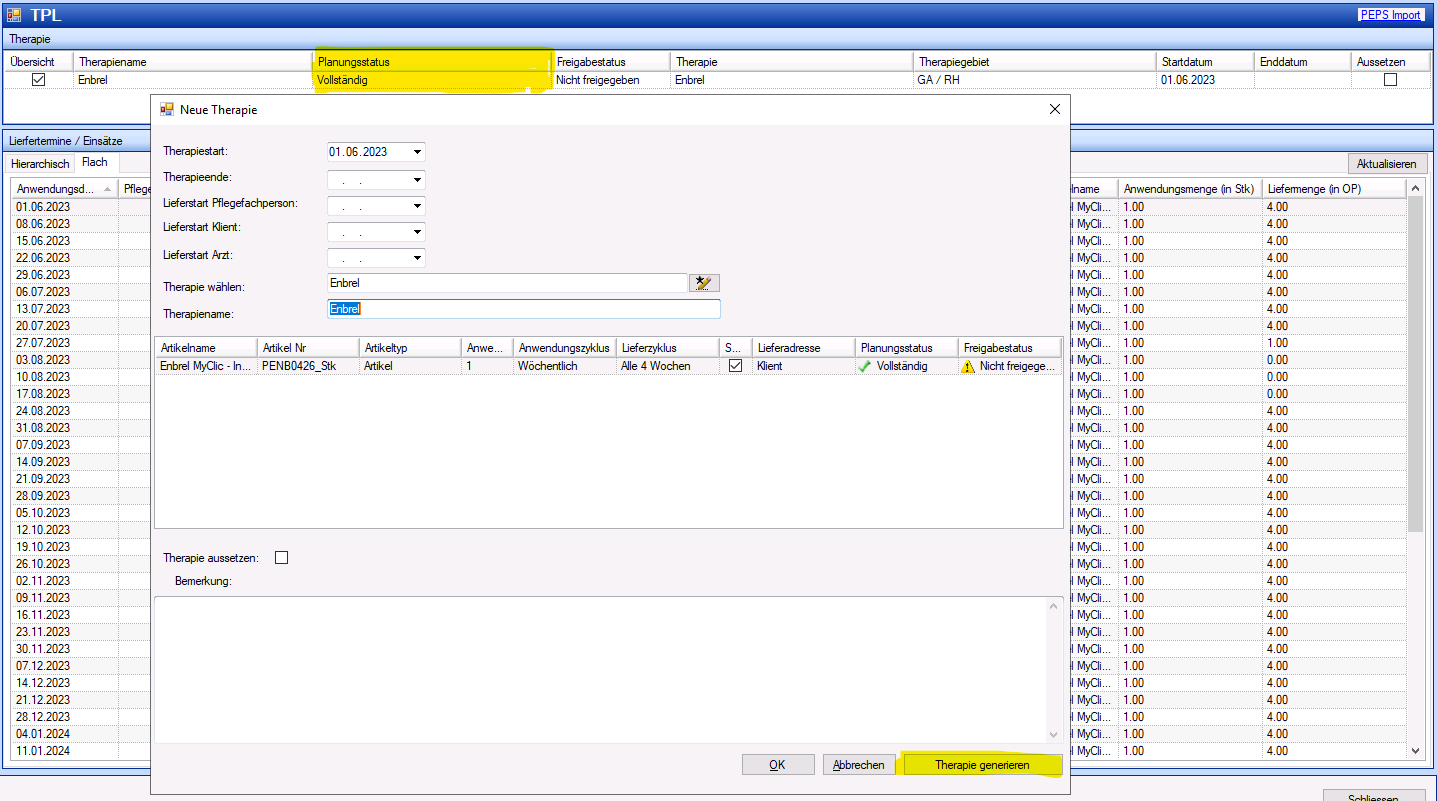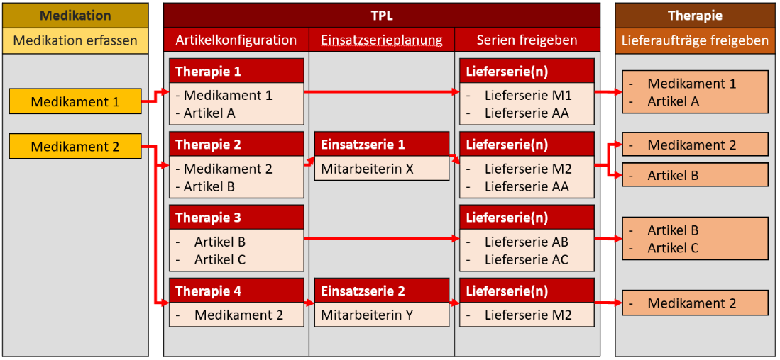 Ziel der Therapieplanung ist es, Einsatz- sowie Lieferserien im Rahmen einer Therapie eines Klienten zu generieren. Die Einsatzserien (sofern vorhanden) können dann einem Mitarbeiter in Nexus / PEPS zugeteilt werden und die Lieferserien generieren einzelne Lieferaufträge, welche an MAWI übermittelt werden können zur Fristgerechten Auslieferung der zur Therapie benötigten Artikel und Medikamente.