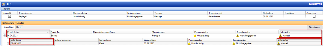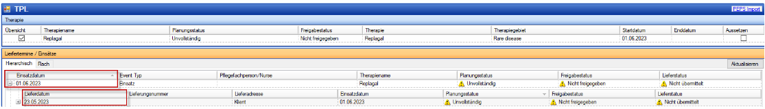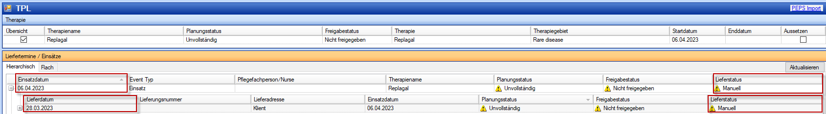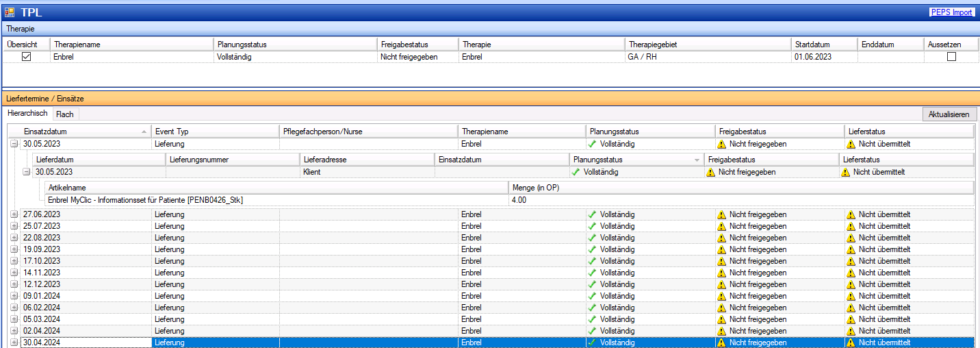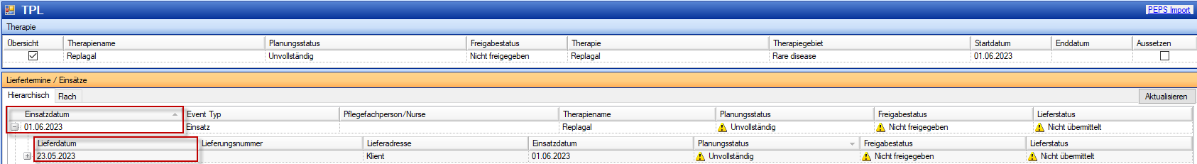 Generierte Therapien (vgl. Therapie generieren) können im Fenster "Liefertermine / Einsätze" angezeigt werden (vgl. Anzeige aller Therapien). Damit sind die Lieferaufträge der Therapie aber noch nicht zwingend bereit zur Übermittlung an MAWI um ausgeliefert werden zu können. Falls für die Verabreichungen (nicht-selbstanwendende Artikel) ein Besuch einer Pflegefachperson nötig ist, müssen zuerst noch die Einsätze in PEPS eingeplant werden. Für die Vervollständigung der Lieferaufträge ist das wichtig, denn nur nach dem Einplanen der Einsätze für eine bestimmte Pflegefachperson wird klar, an welche Lieferadresse die Lieferaufträge im Falle des Lieferadresstyps "Pflegefachperson" gesendet werden müssen.