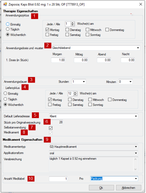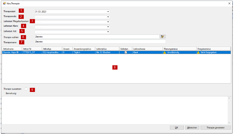 • Therapie: hier stehen sämtliche Therapien des zuvor gewählten Klienten zur Auswahl. Jeder Lieferauftrag muss einer Therapie und damit einer Medikation zugeordnet werden können.