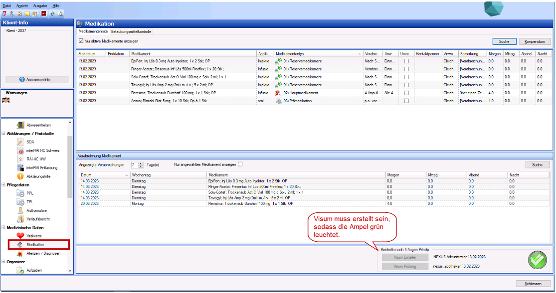 Die Medikation muss in der unteren rechten Ecke visiert werden, damit deren Einträge für die Therapieplanung weiterverarbeitet werden können. Die Berechtigung kann Benutzern in Nexus Administration unter "Berechtigungen" erteilt werden.