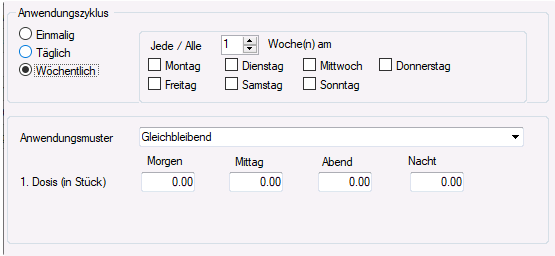 Im Mittelteil kann der Anwendungszyklus "Einmalig", in einem Tages- oder Wochenrhythmus inkl. dem vorgesehenen Wochentag angegeben werden. Mit dem Anwendungszyklus wird definiert, an welchen Daten ein oder mehrere Stück eines Artikels/Medikaments verabreicht wird.
