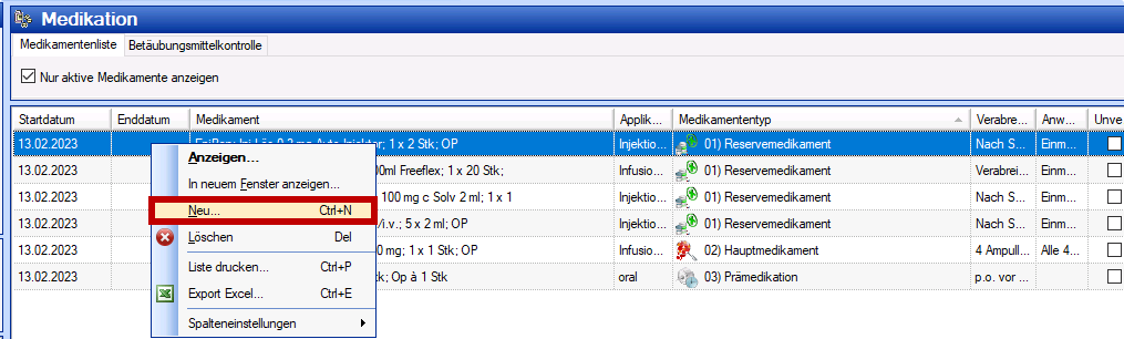 Zum Erfassen eines neuen Medikationseintrags kann im Register "Medikamentenliste" im Kontextmenü unter "Neu" gewählt werden.