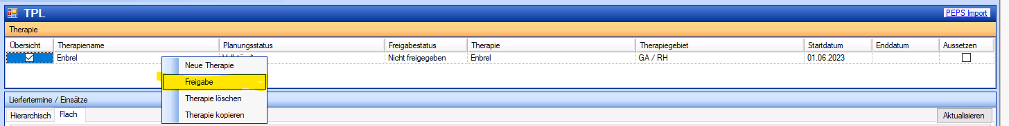 Sobald bei einer Therapie der Planungsstatus auf "Vollständig" gesetzt ist, ist die Therapie bereit zur Freigabe. Die Freigabe bewirkt, dass die Lieferaufträge dieser Therapie im Modul "Therapie" verfügbar zum Export nach MAWI gemacht werden. Die Freigabe wird mit dem Knopf "Freigabe" im Kontextmenü auf der Therapie gemacht.
