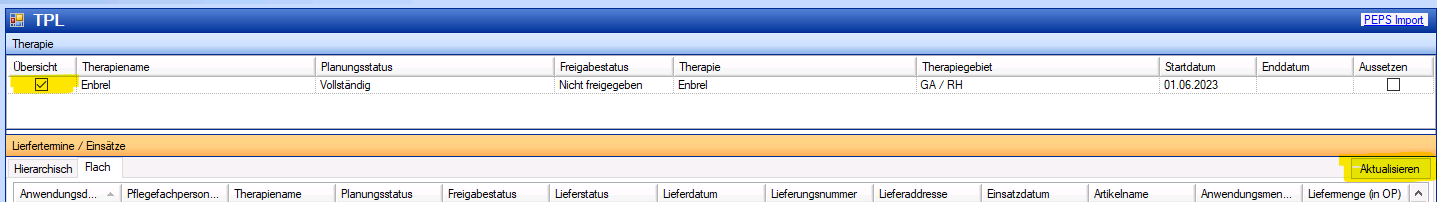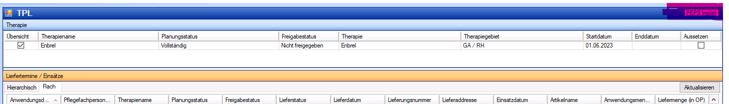 • Import der PEPS Daten ins Spitex: Anschliessend müssen die Daten aus dem PEPS wieder zurück ins Spitex importiert werden. Dies geschieht über Nacht automatisch. Es kann aber auch manuell ausgelöst werden über den Knopf "PEPS Import" in der TPL. Mit dem Import werden die fehlenden Daten der Therapien vervollständigt. Das heisst, es werden, wo nötig, die Pflegefachpersonen auf den Einsätzen und damit die Lieferadressaten der jeweiligen Lieferaufträge ergänzt.