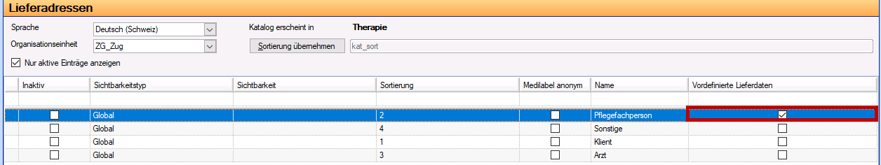 Lieferadresse TypDamit kann nach einem bestimmten Typ Lieferadresse, d.h. Klient, Pflegefachperson oder Arzt, gesucht werden. Vgl. Lieferadresstypen.
