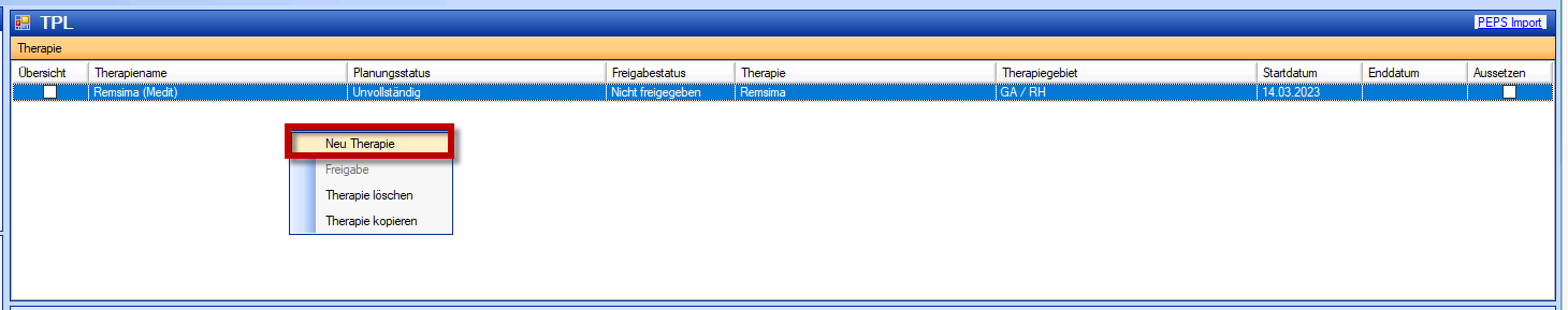 Eine neue Therapie wird einem Klienten in dessen Klientendossier unter TPL mittels "Neue Therapie" im Kontexmenü hinzugefügt.