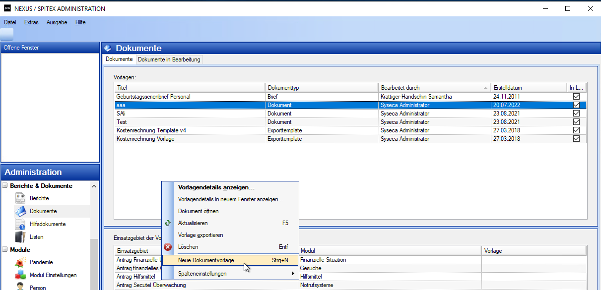 Speichern Sie die zuvor erstellte Datei an einem beliebigen Ort auf Ihrem PC. Öffnen Sie NEXUS / SPITEX®Administration und navigieren Sie zum Bereich Dokumente. Wählen Sie nach einem Rechtsklick im Bereich Vorlagen die Option Neue Dokumentvorlage... aus dem Kontextmenü.