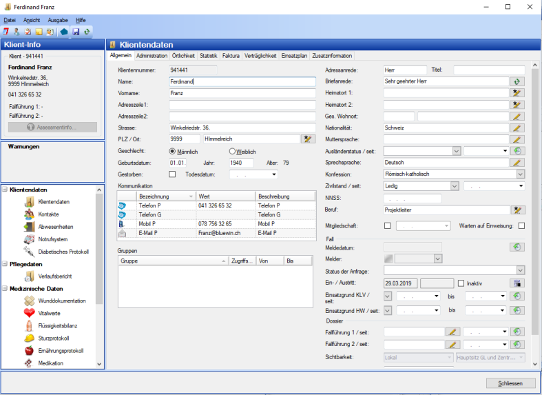 Bei den Kontakten sind Versicherung, Arzt und Kontaktperson hinterlegt: