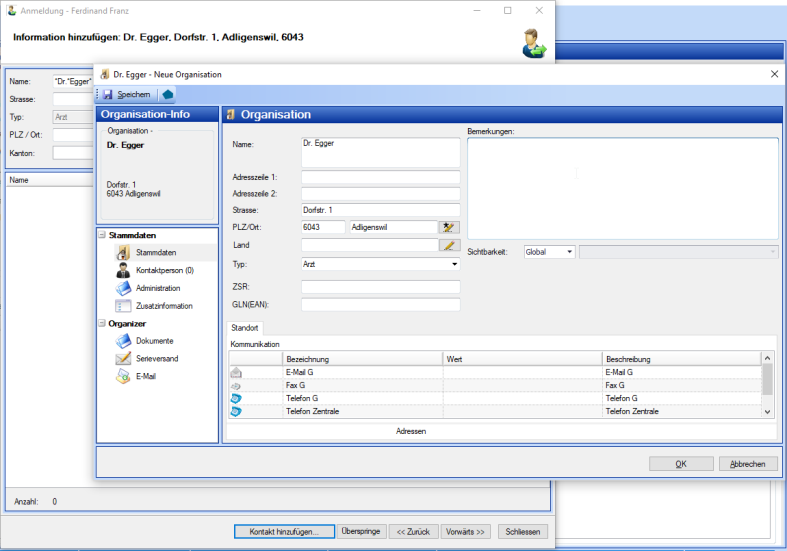 Es ist zu beachten, dass der Typ Arzt definiert wird, sonst kann die Adresse anschliessend nicht gewählt werden.